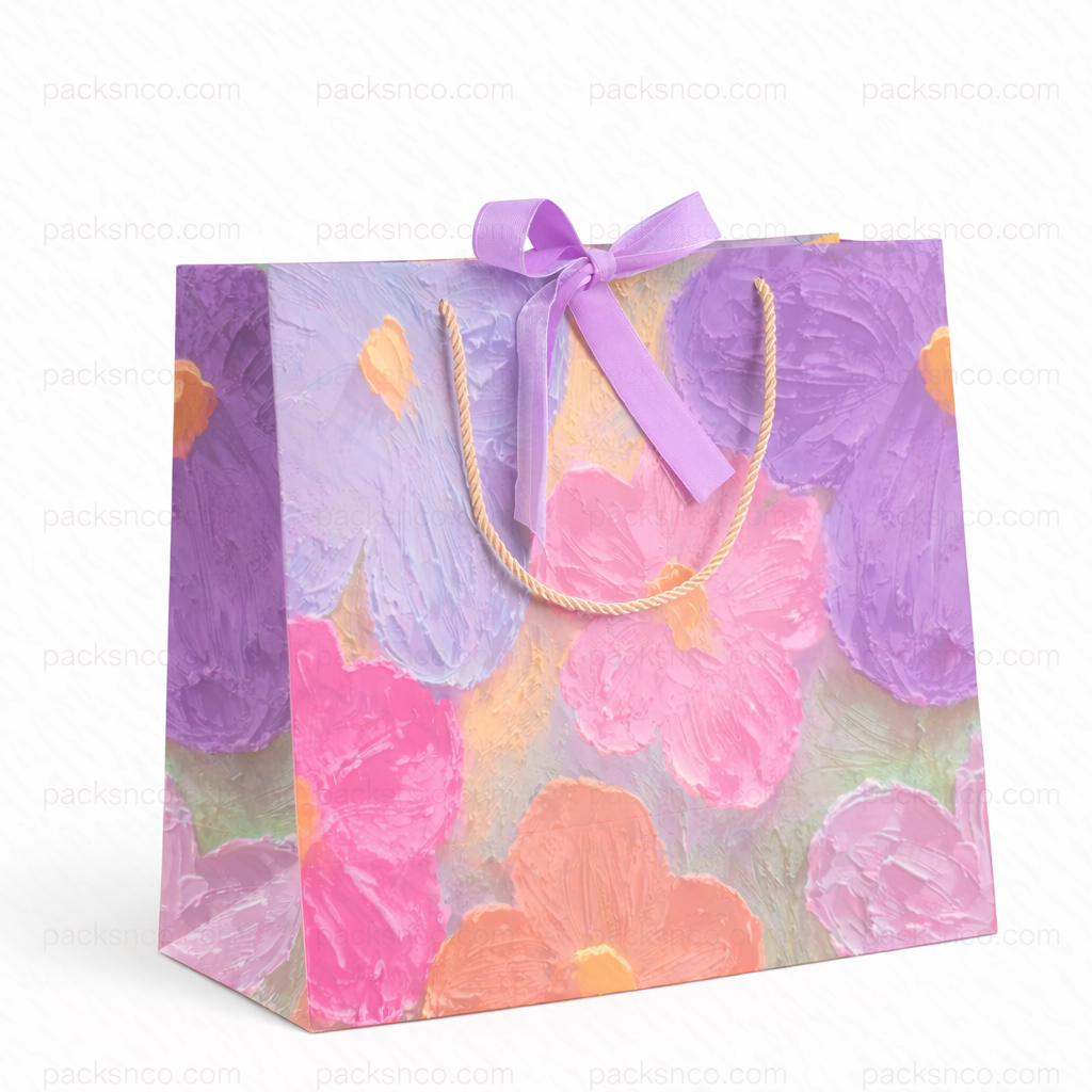 An elegant paper gift bag with a soft floral finish, durable rope handles, and a delicate ribbon bow—designed to elevate premium gifts and luxury packaging.